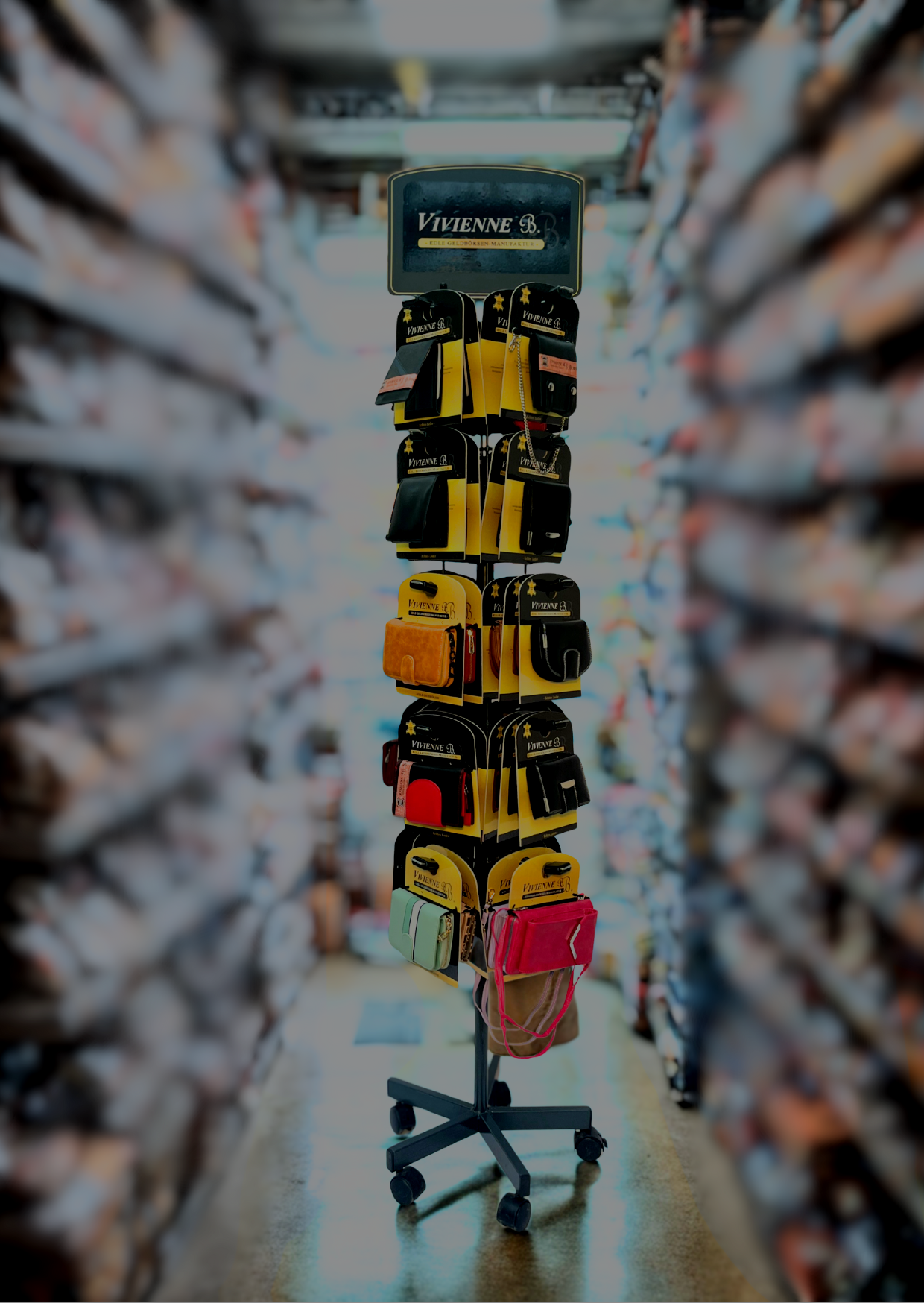 Wir bieten Ihnen zwei Arten von Verkaufsständern an: 1. Geldbörsen und/oder 2. Gürtel. Bei dem Geldbörsenverkaufständer werden Damen- und Herrengeldbörsen und jeweils Leder- und Kunstledergeldbörsen verkauft.