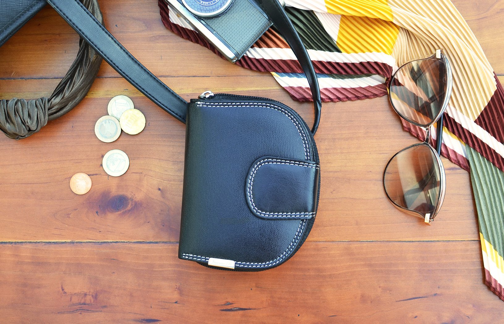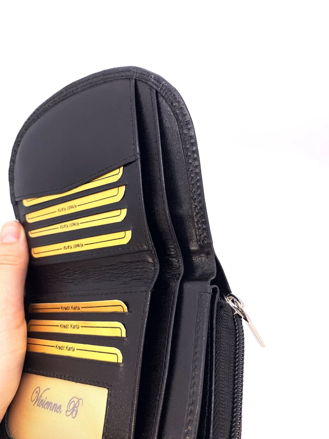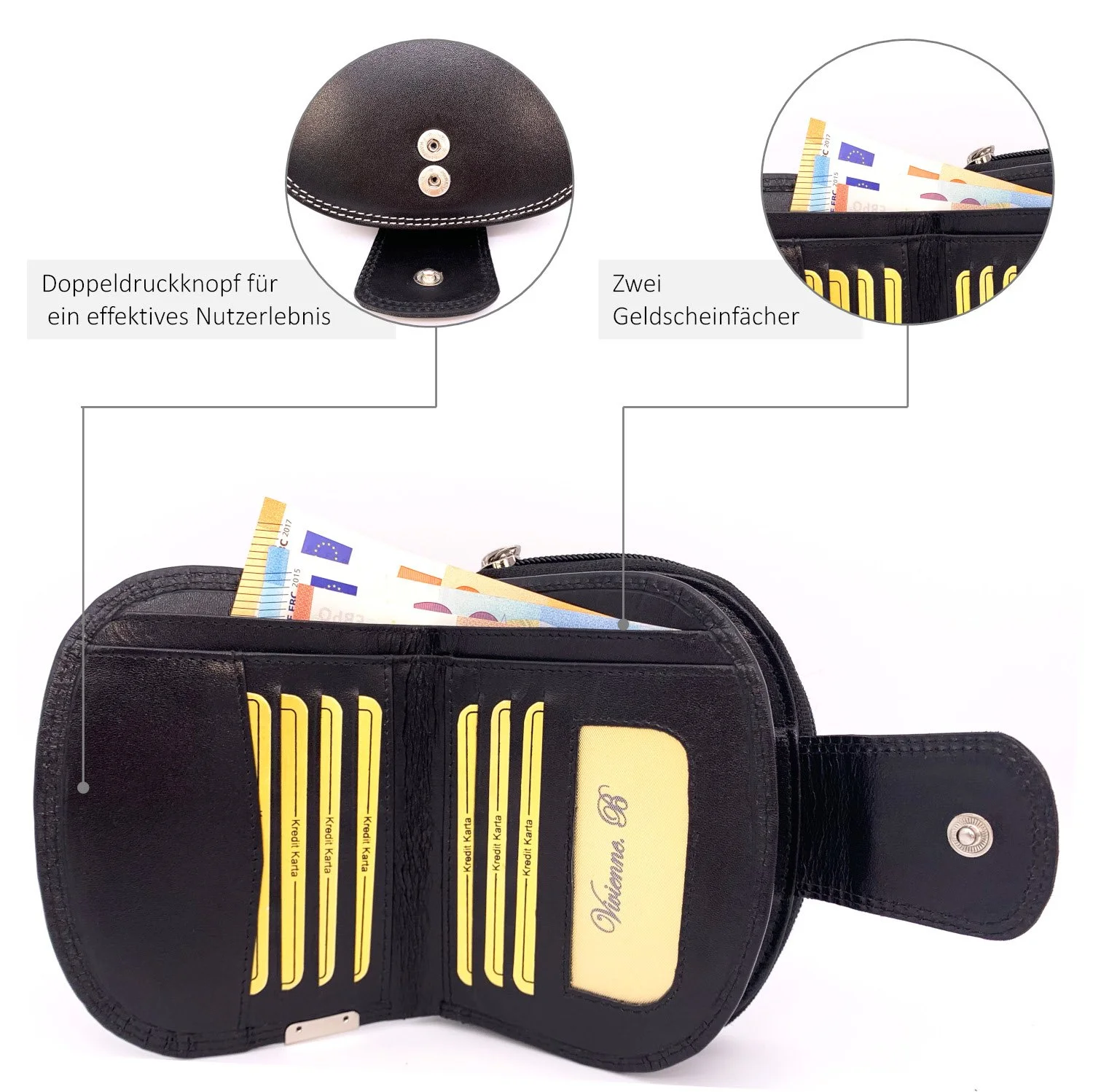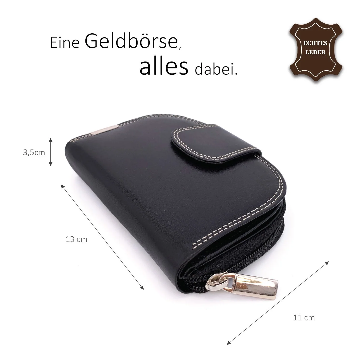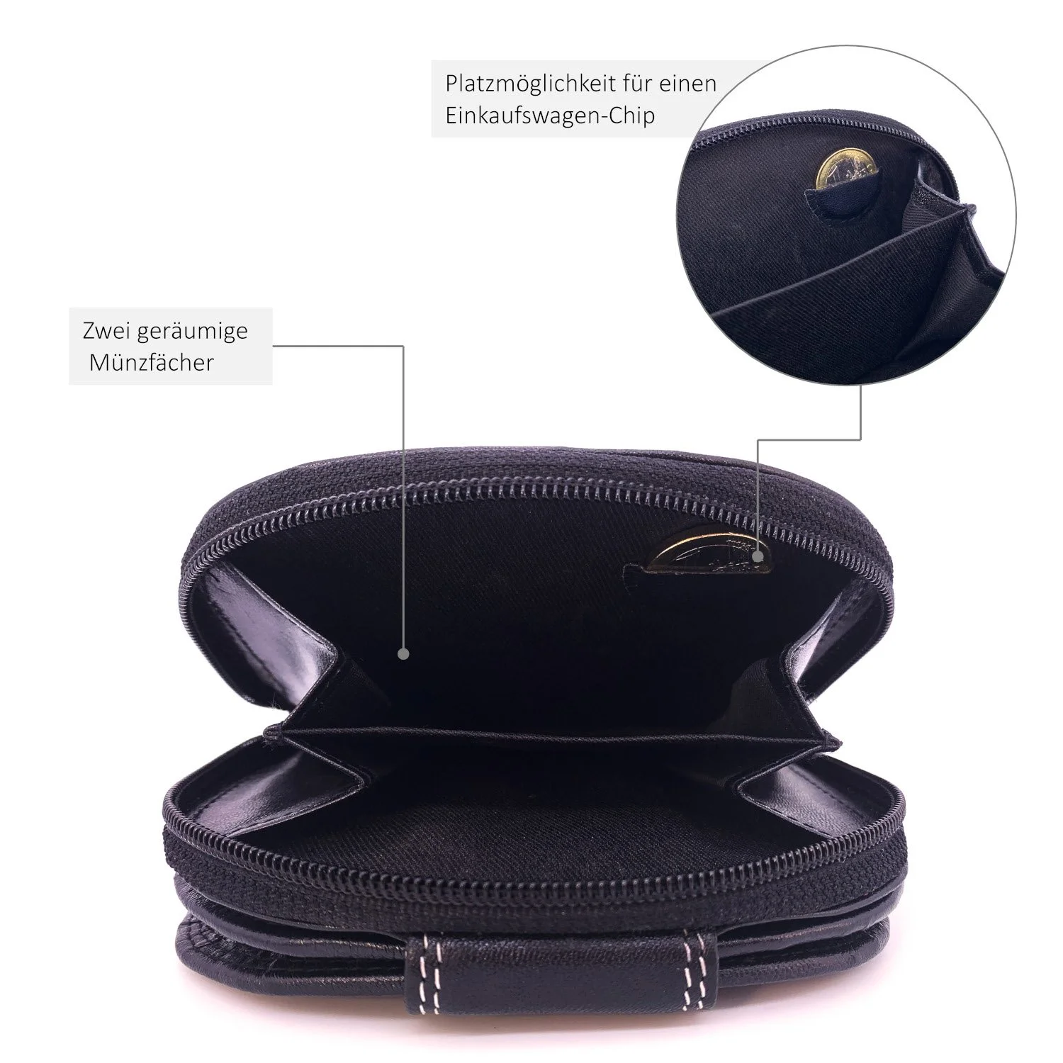 • 2 Geldscheinfächer und 2 Münzenfächer mit 1 Reißverschluss