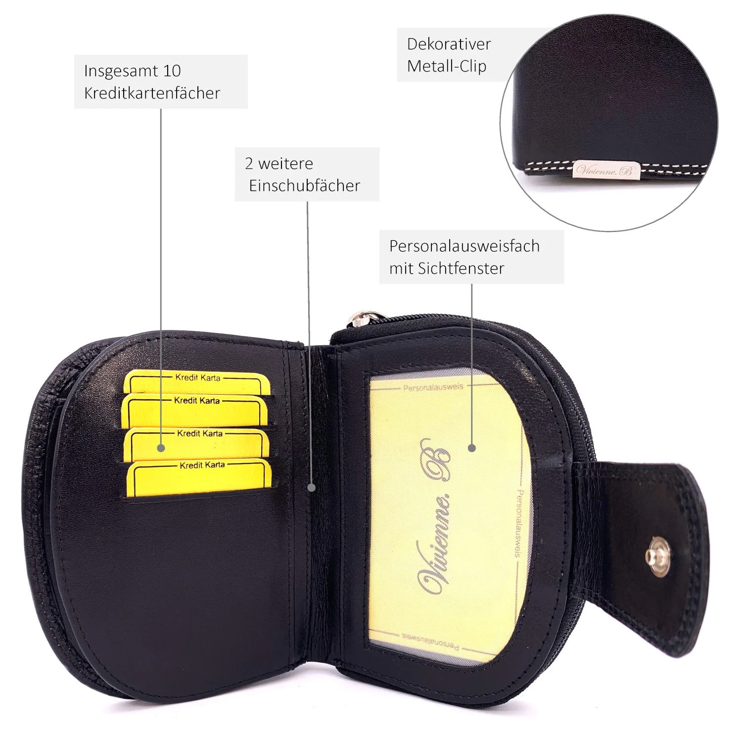 Vivienne B. hochwertige Damen Ledergeldbörse Reißverschluss-Sicherheitsfach